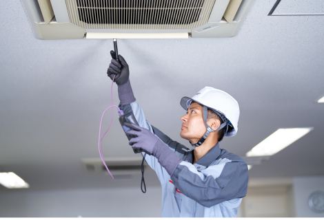 - 室内に設置する機器。主な作業は清掃や正常動作の確認。空調効果の低下や無駄な電力消費を招くフィルターの汚れを清掃します。機器内部のドレン排水の点検は異臭予防にも効果があります。定期的な点検により快適な空間づくりのお手伝いをします。